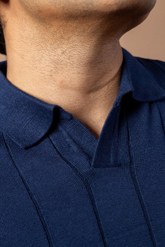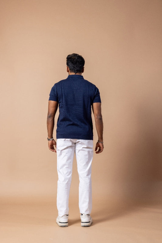 Navy Blue Rib Knit Polo T-Shirt & White Linen Pant Regular Fit Combo